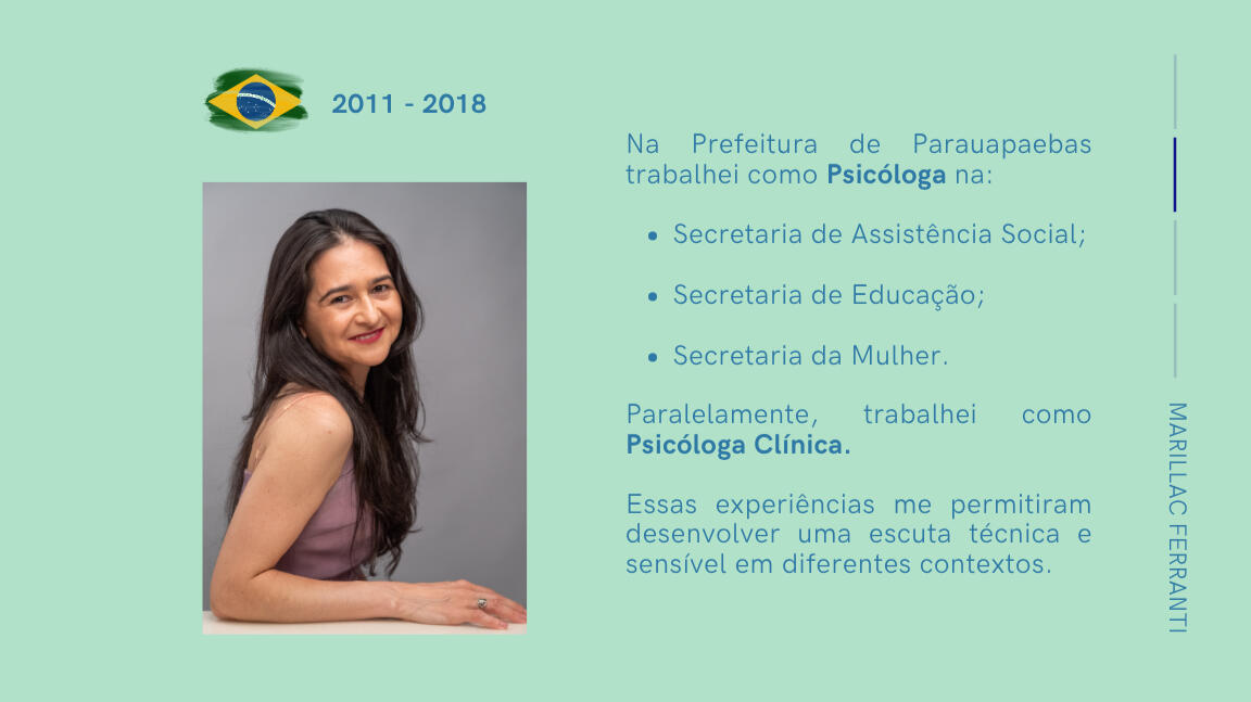 Sou Marillac Ferranti, Psicóloga Clínica com 14 anos de experiência no Brasil, meu país de nascimento, e em Portugal onde moro há 7 anos. Realizo atendimento para adolescentes e adultos. Meu consultório é Online.Sinto-me realizada e feliz por oferecer um cuidado terapêutico que proporciona alívio ao cliente. Ao se sentir acolhido e compreendido, ele reencontra a leveza para amar, dormir, comer e trabalhar. É essa transformação que dá sentido à minha atuação como psicóloga.