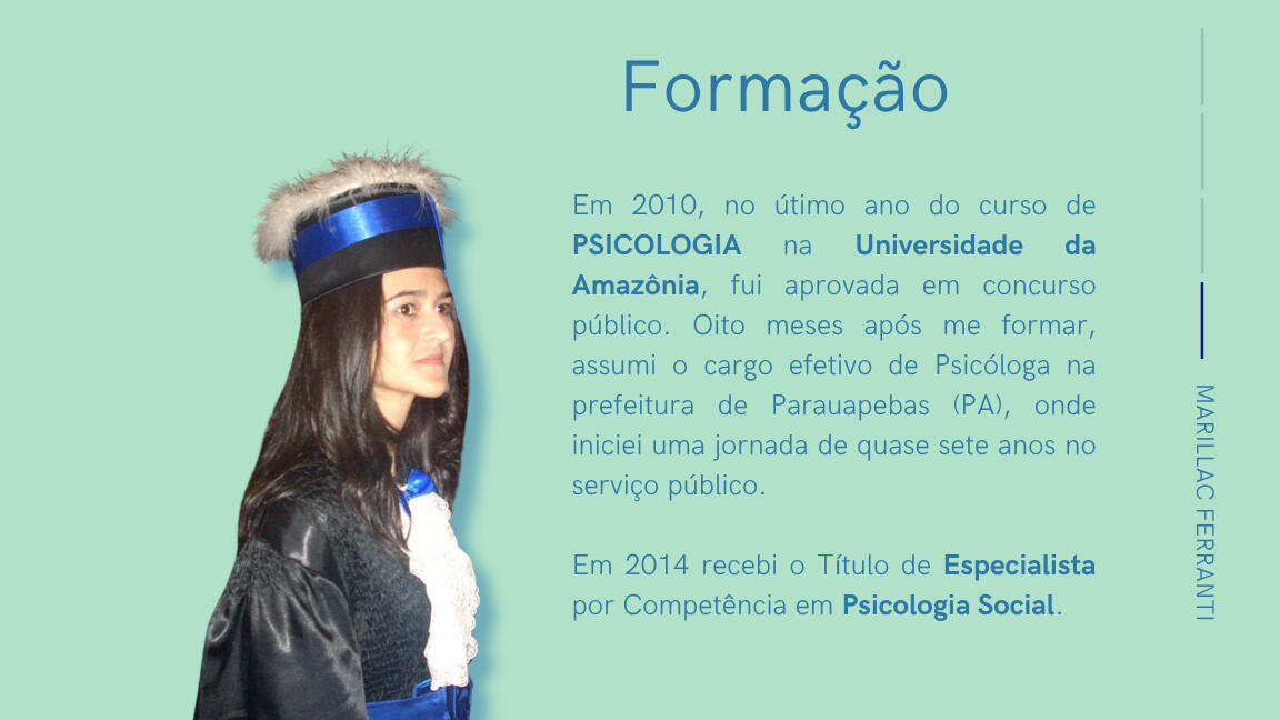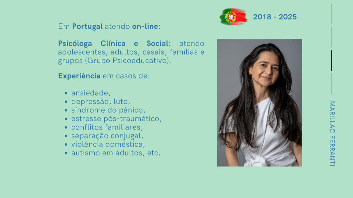Sou Marillac Ferranti, Psicóloga Clínica com 14 anos de experiência no Brasil, meu país de nascimento, e em Portugal onde moro há 7 anos. Realizo atendimento para adolescentes e adultos. Meu consultório é Online.Sinto-me realizada e feliz por oferecer um cuidado terapêutico que proporciona alívio ao cliente. Ao se sentir acolhido e compreendido, ele reencontra a leveza para amar, dormir, comer e trabalhar. É essa transformação que dá sentido à minha atuação como psicóloga.